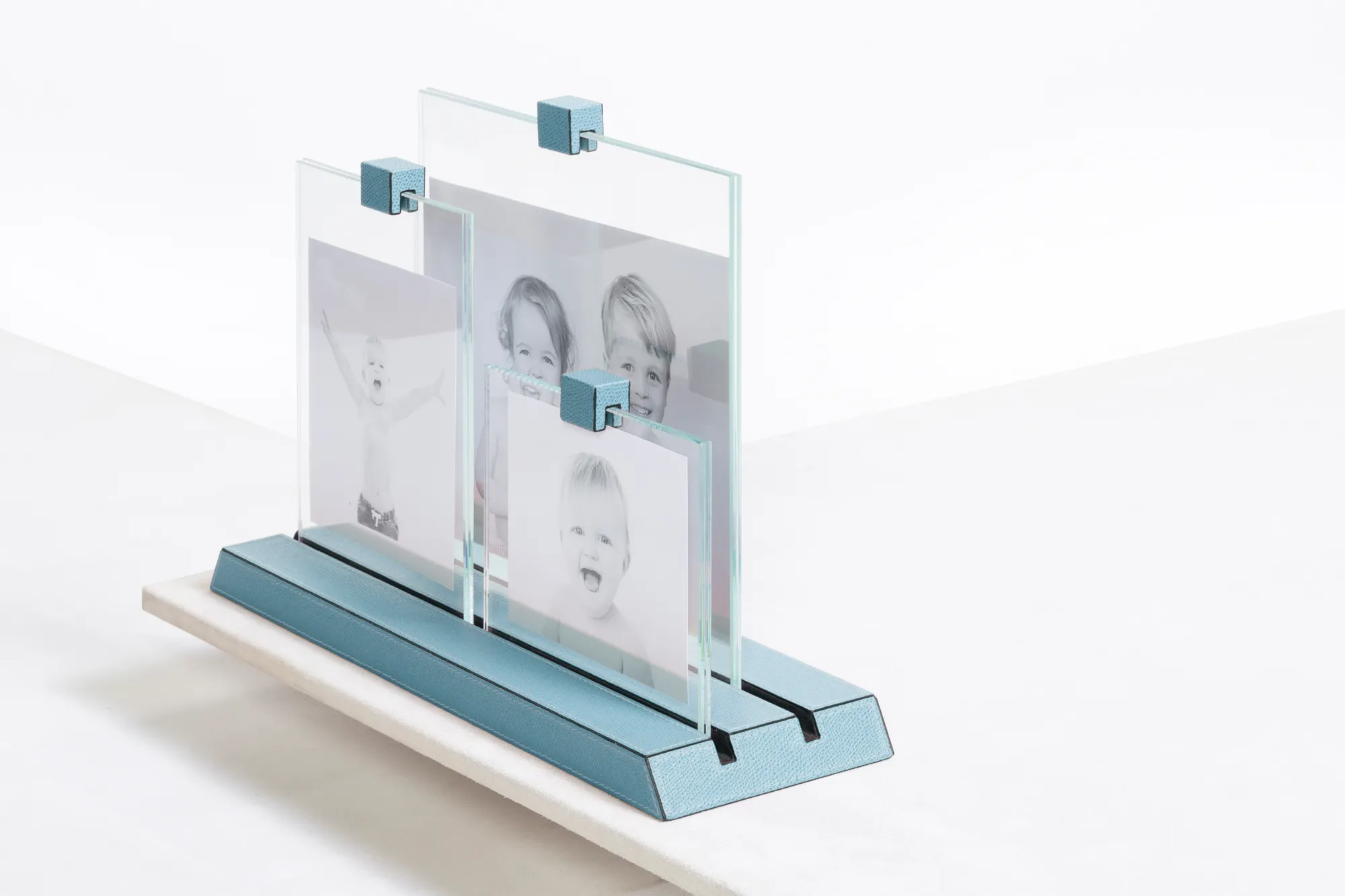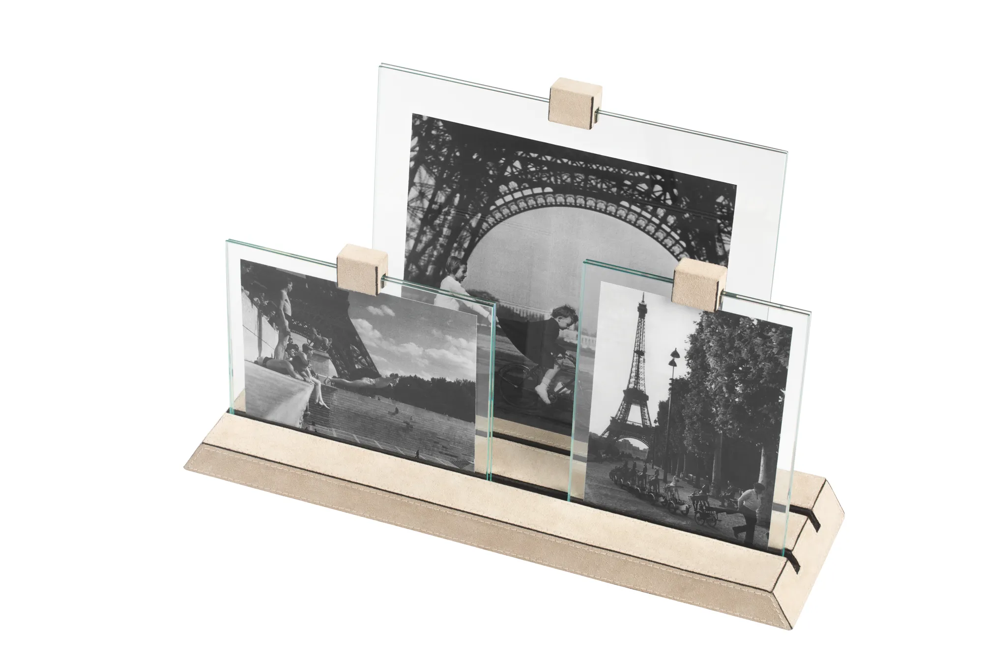 Leather covered wood base hosting 3 polished glass frames. Pictures can fit horizontally or vertically.