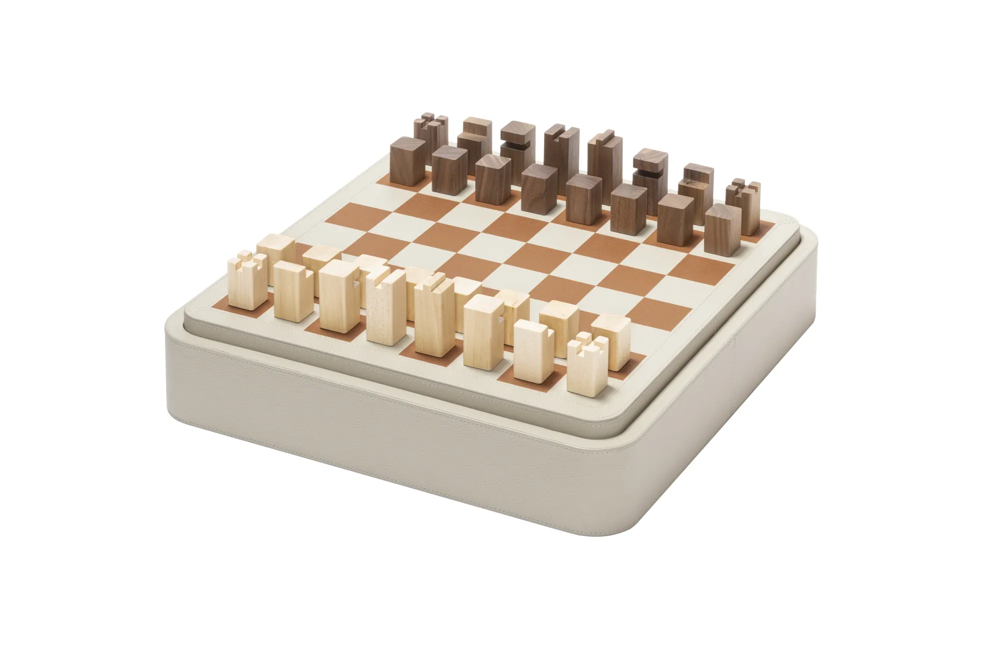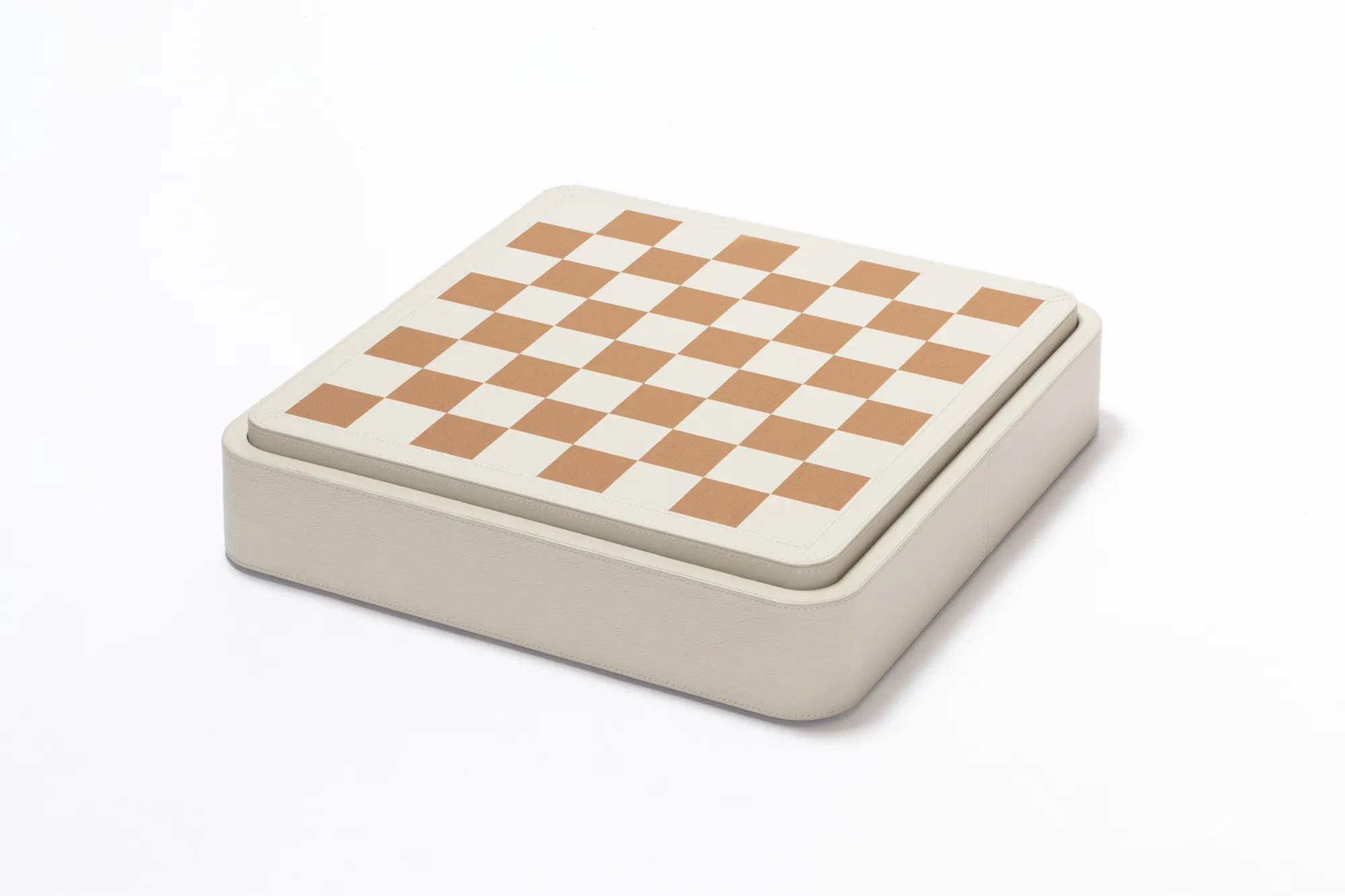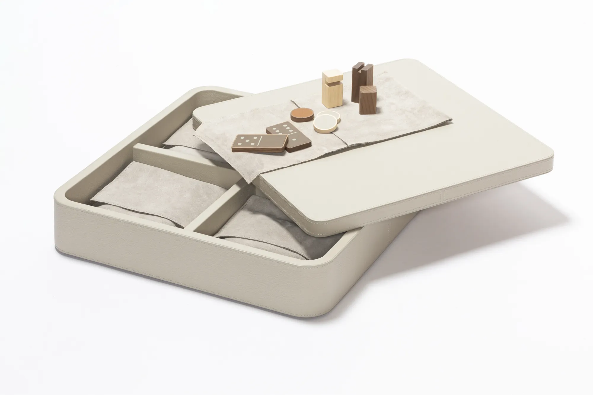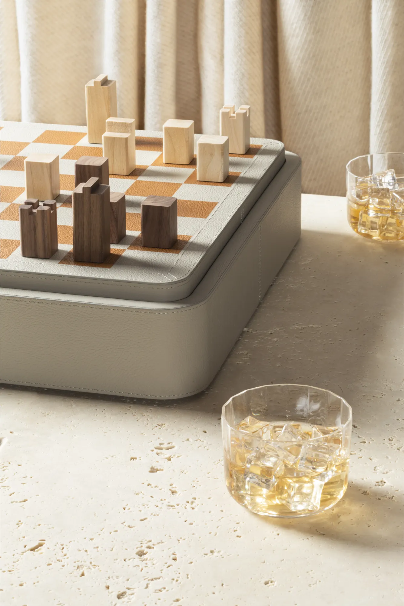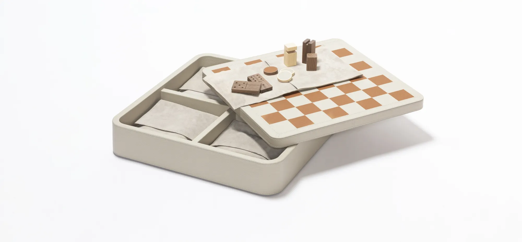 The triple game box is extremely versatile and offers multiple ways of playing. It features a fine leather-covered wood structure with a checkered inlaid top where chess and checkers can be played, and includes a set of domino pieces. All pawns are contained inside the box which has four inner sections. Set is equipped with: maple and walnut chess pieces, maple and walnut draughts featuring fine leather inserts and engraved walnut dominoes. Entirely made in Pelle Frau®.
