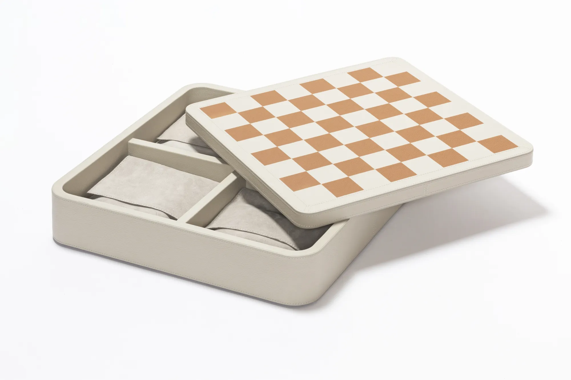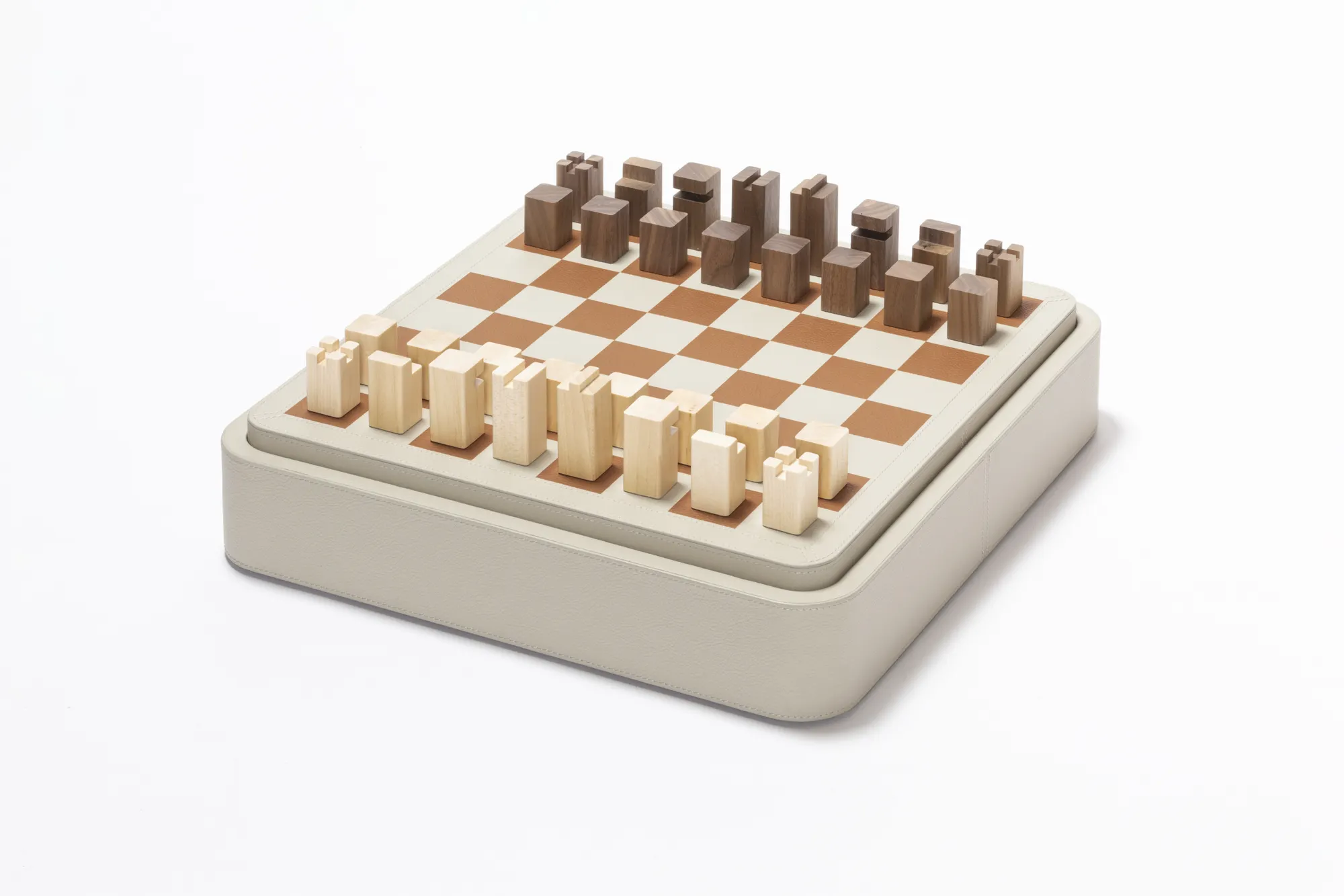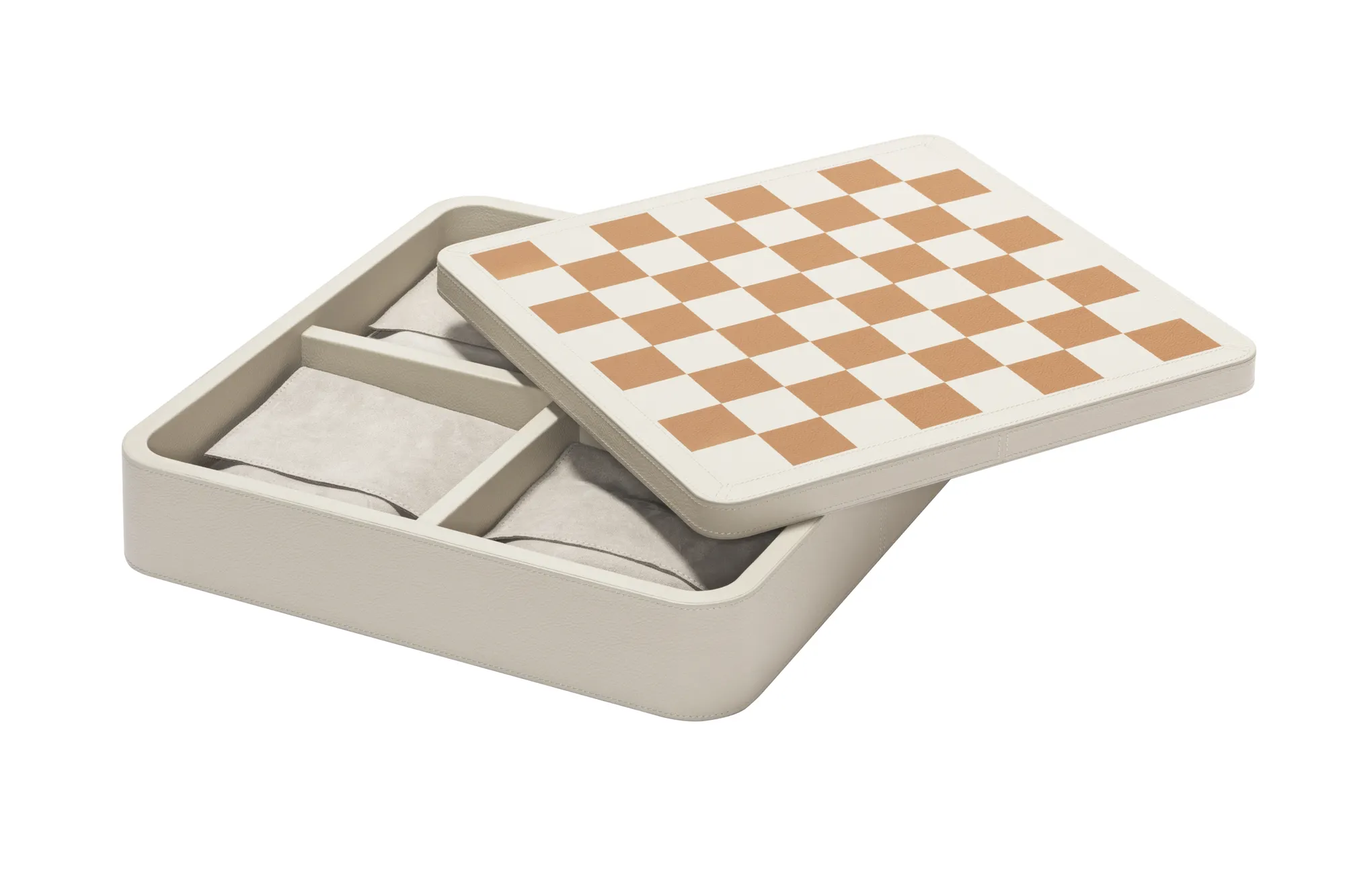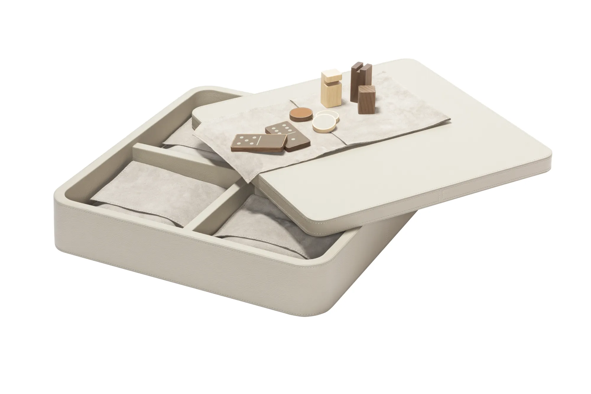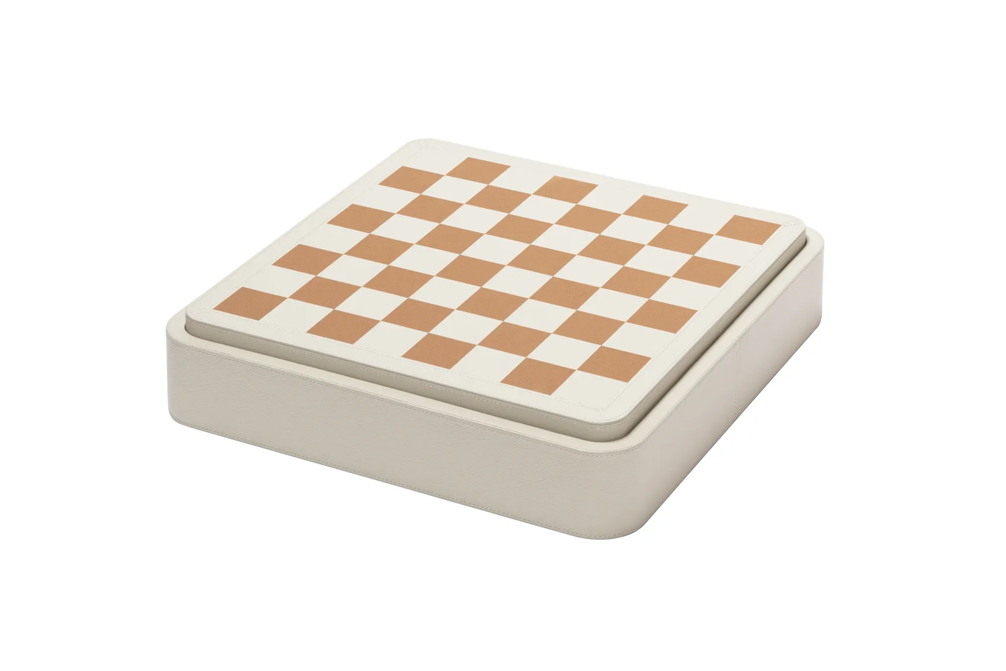 The triple game box is extremely versatile and offers multiple ways of playing. It features a fine leather-covered wood structure with a checkered inlaid top where chess and checkers can be played, and includes a set of domino pieces. All pawns are contained inside the box which has four inner sections. Set is equipped with: maple and walnut chess pieces, maple and walnut draughts featuring fine leather inserts and engraved walnut dominoes. Entirely made in Pelle Frau®.