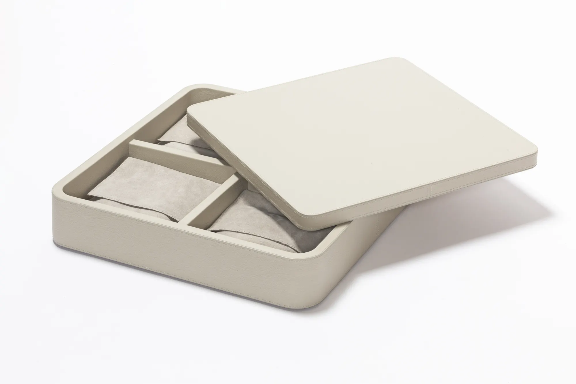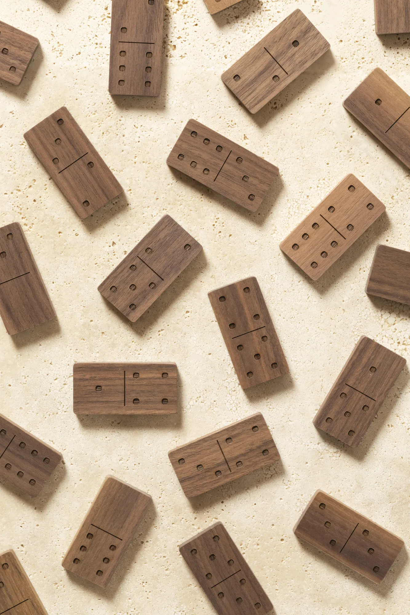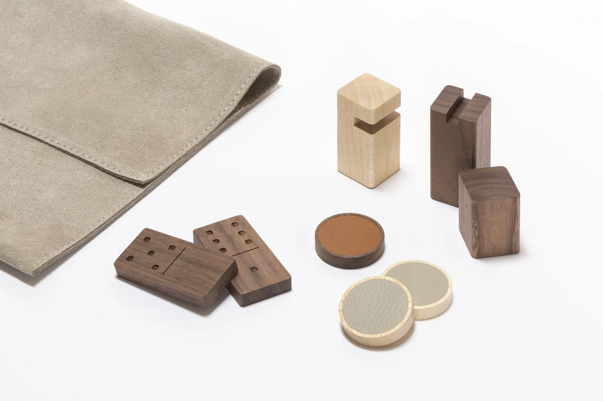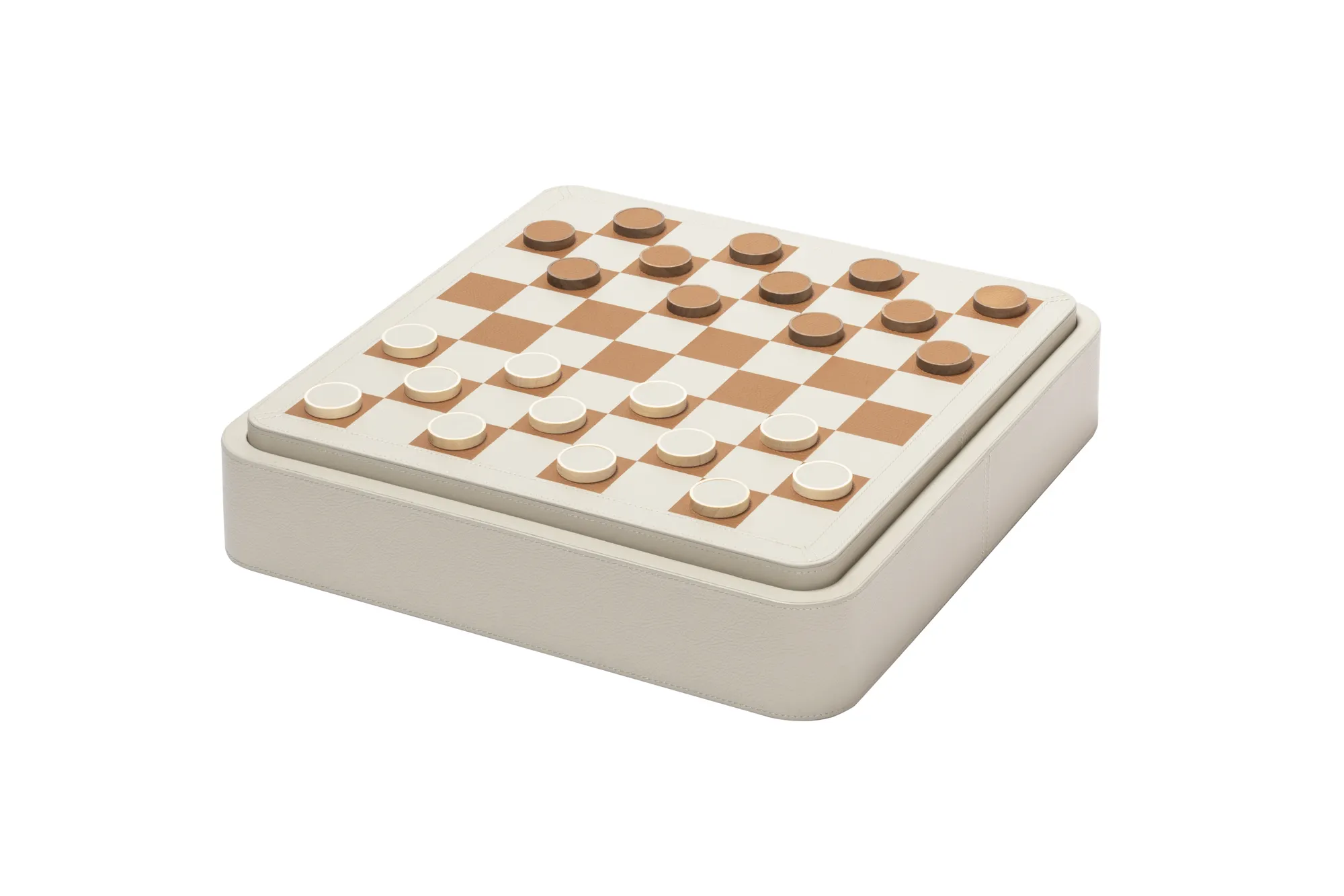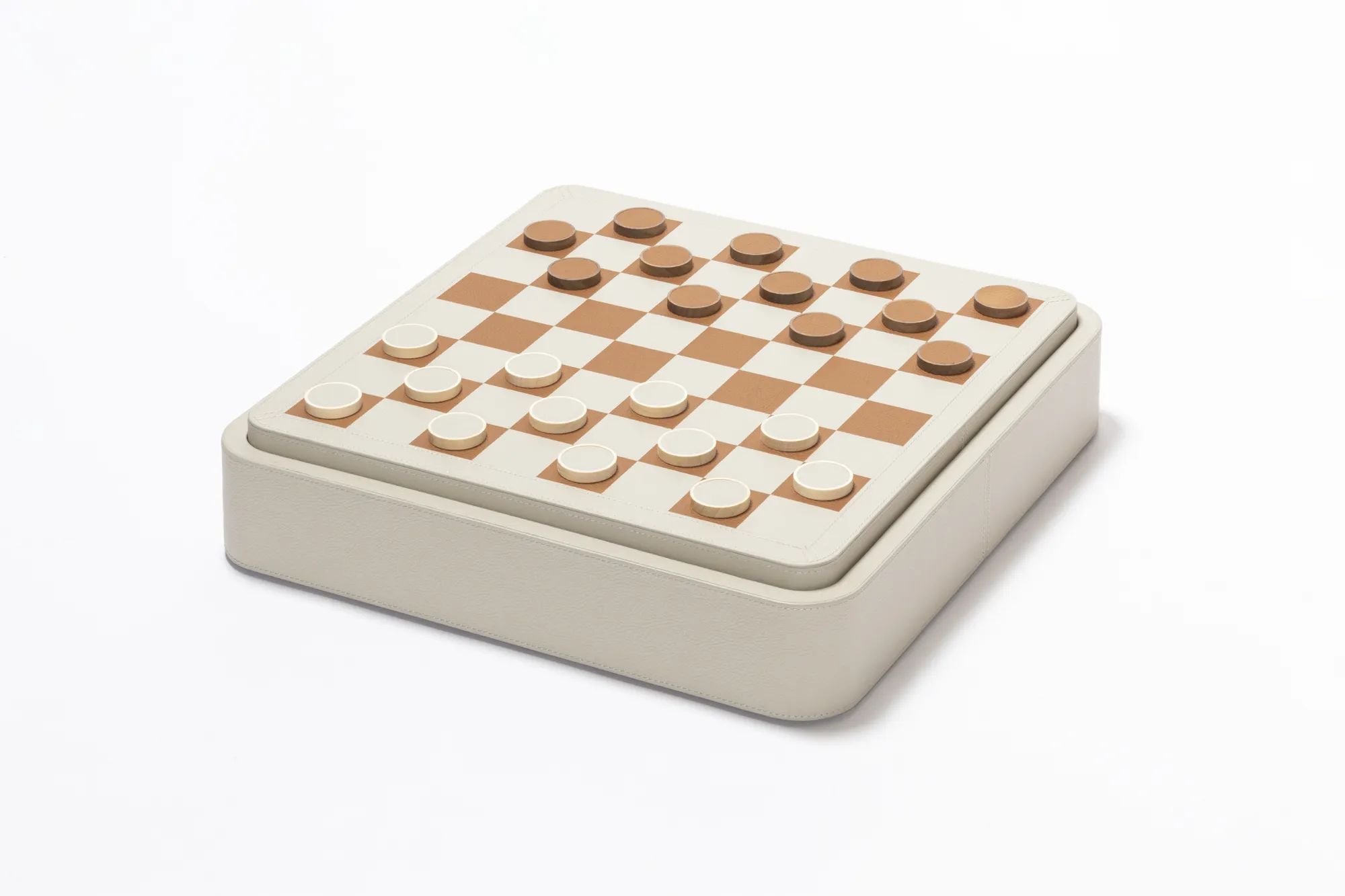 The triple game box is extremely versatile and offers multiple ways of playing. It features a fine leather-covered wood structure with a checkered inlaid top where chess and checkers can be played, and includes a set of domino pieces. All pawns are contained inside the box which has four inner sections. Set is equipped with: maple and walnut chess pieces, maple and walnut draughts featuring fine leather inserts and engraved walnut dominoes. Entirely made in Pelle Frau®.