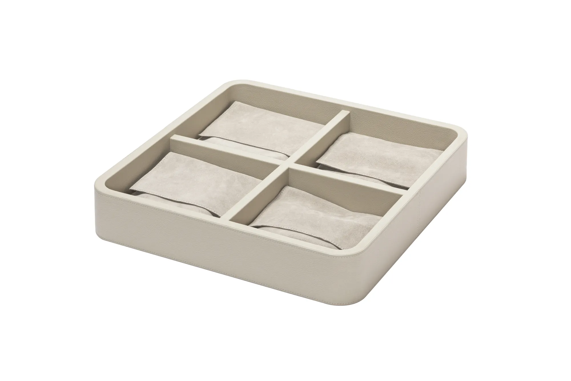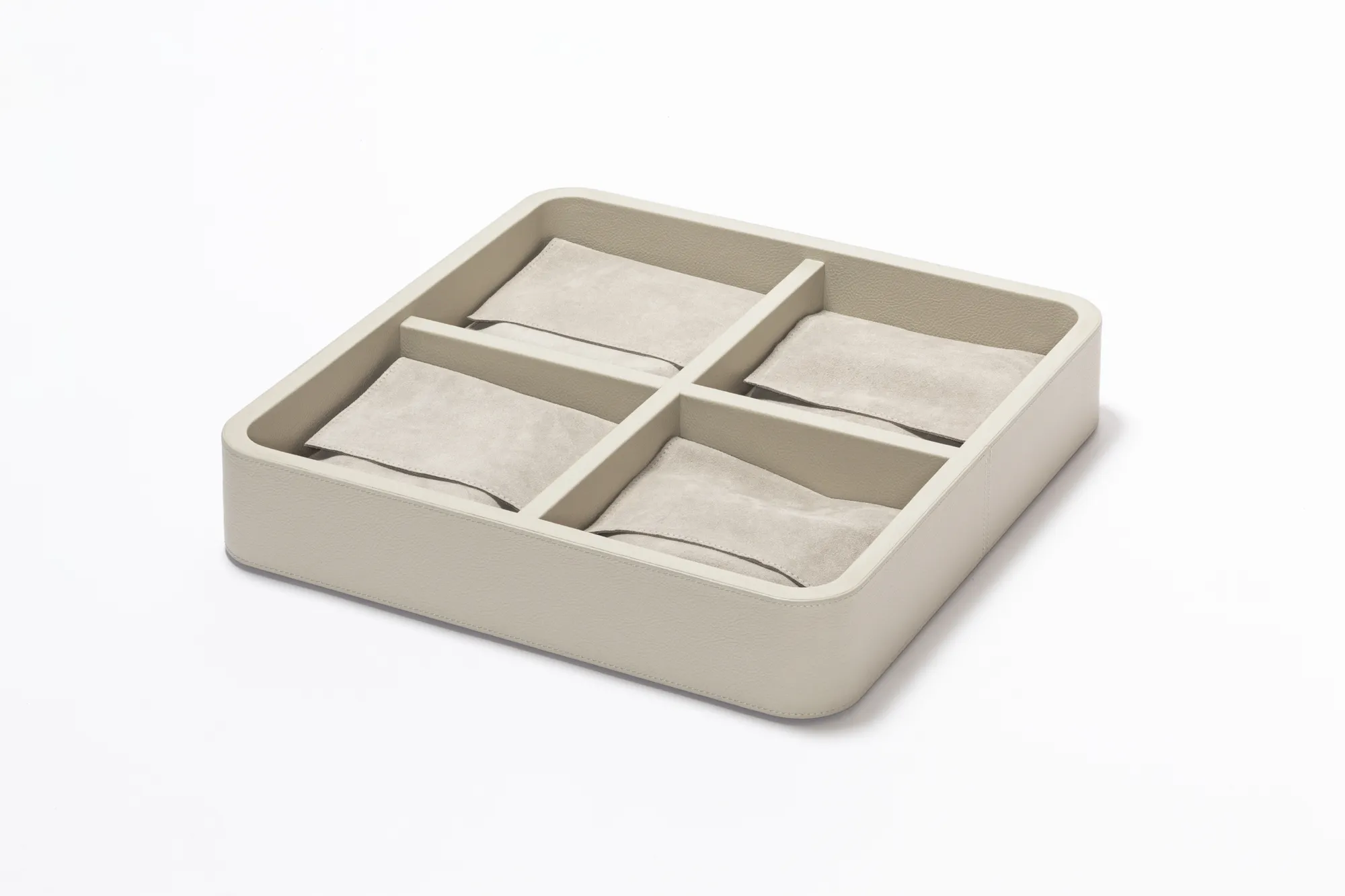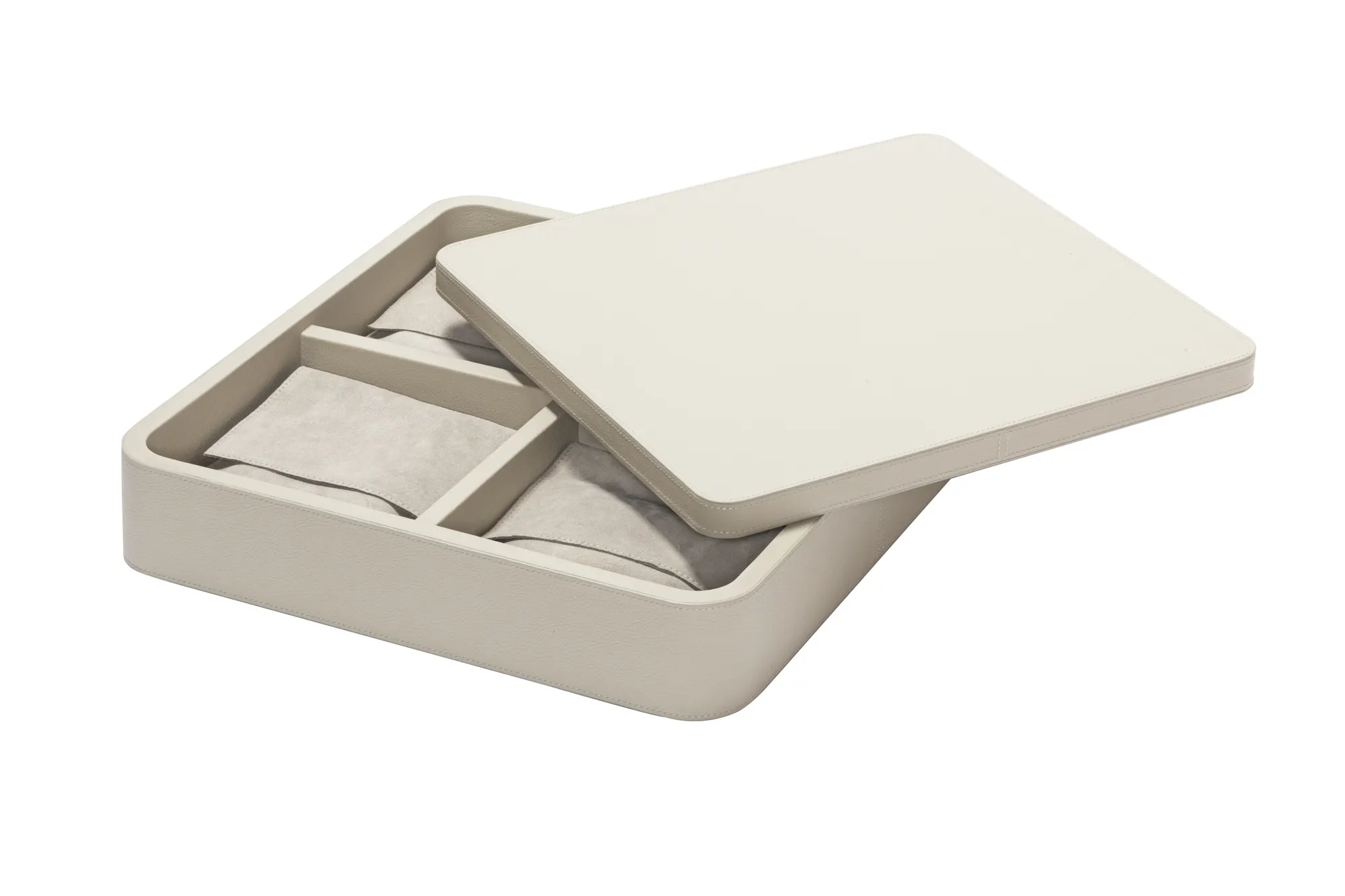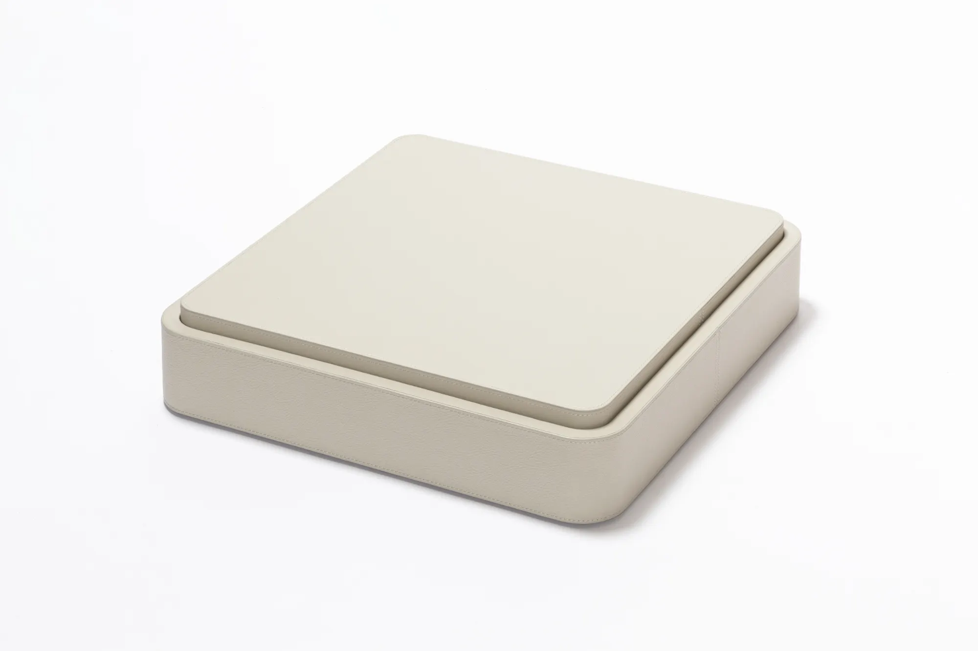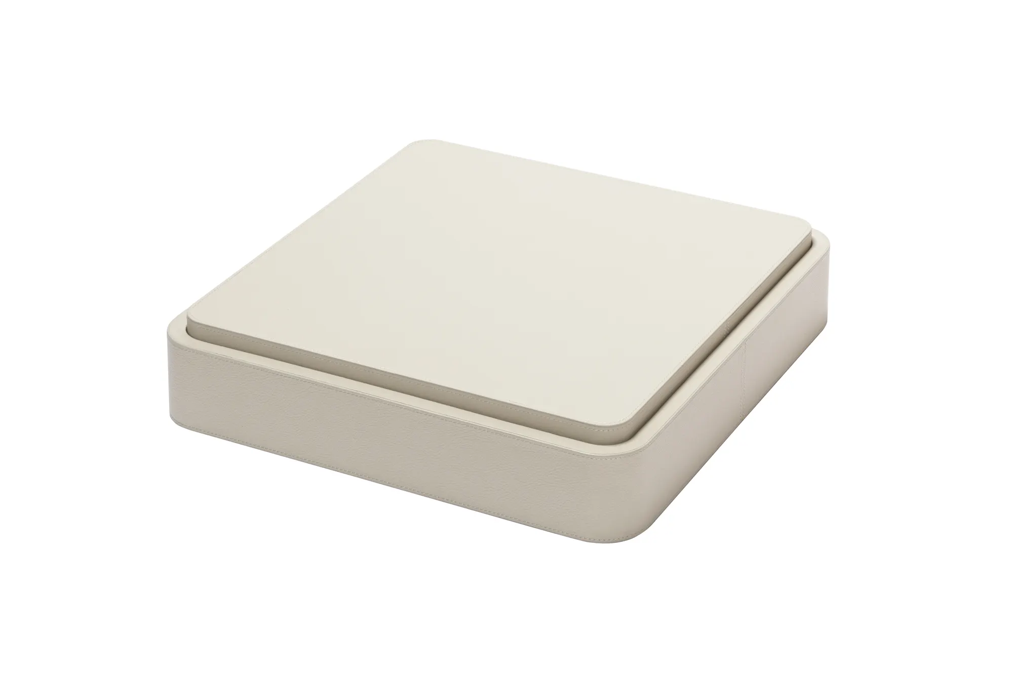 The triple game box is extremely versatile and offers multiple ways of playing. It features a fine leather-covered wood structure with a checkered inlaid top where chess and checkers can be played, and includes a set of domino pieces. All pawns are contained inside the box which has four inner sections. Set is equipped with: maple and walnut chess pieces, maple and walnut draughts featuring fine leather inserts and engraved walnut dominoes. Entirely made in Pelle Frau®.