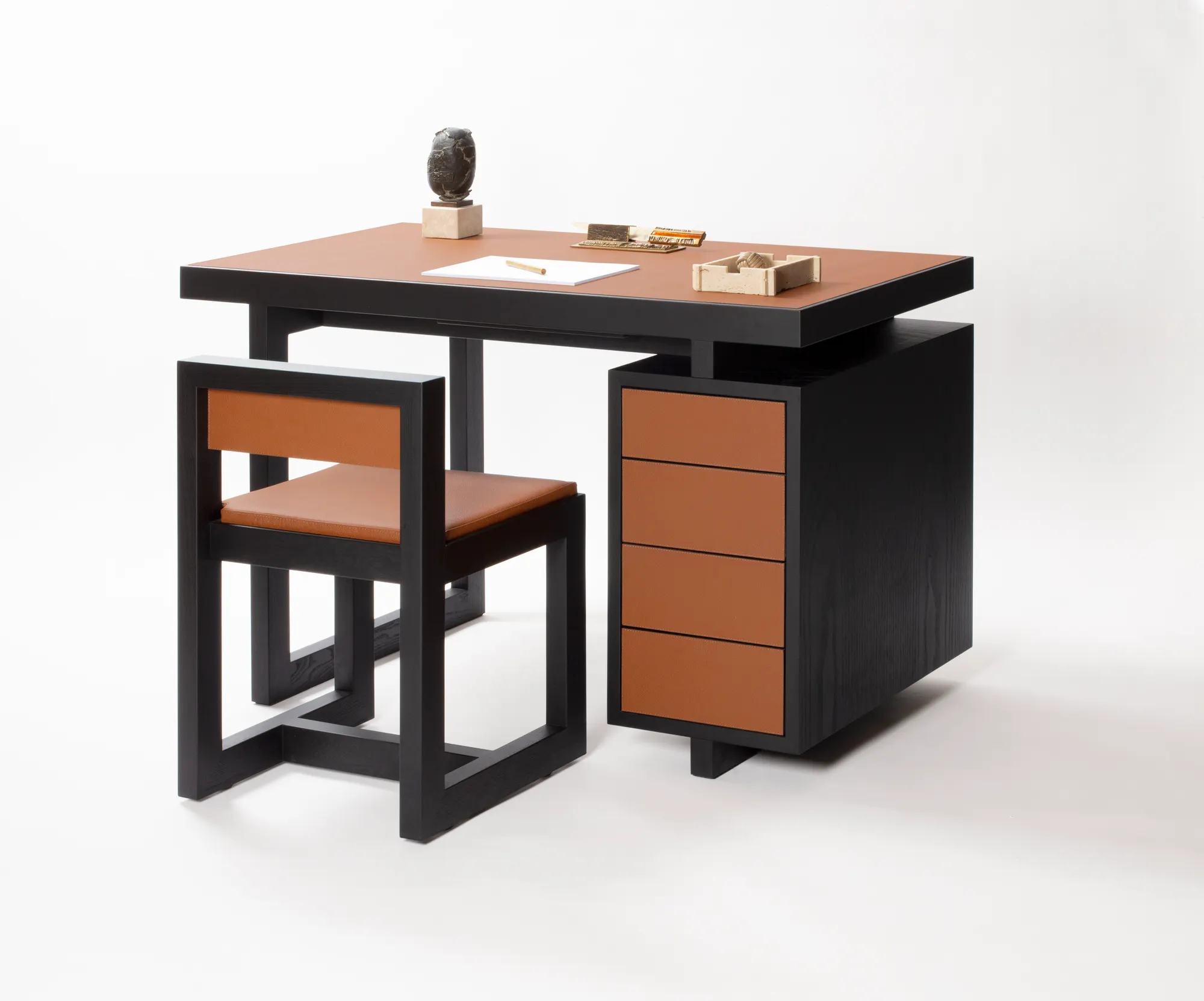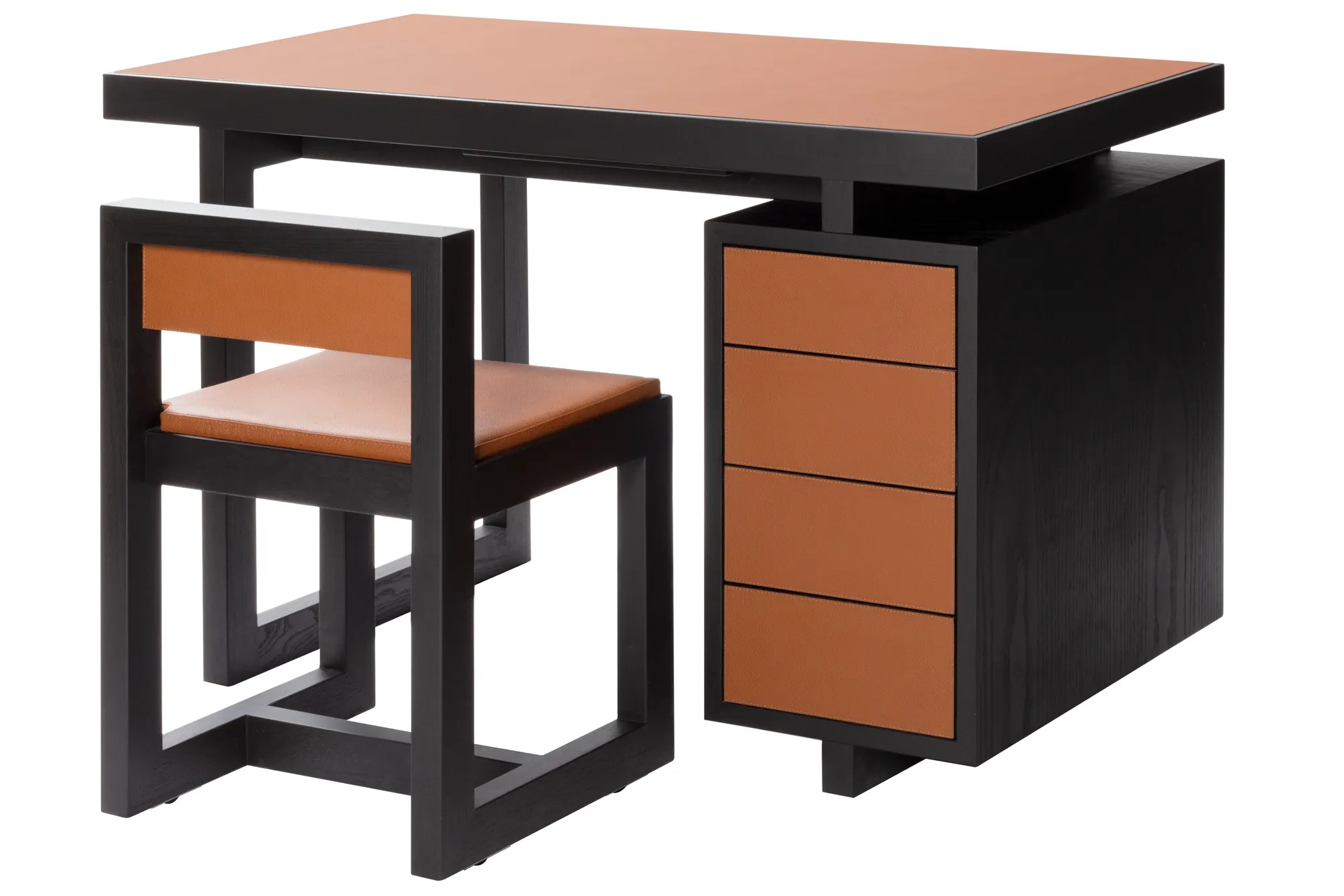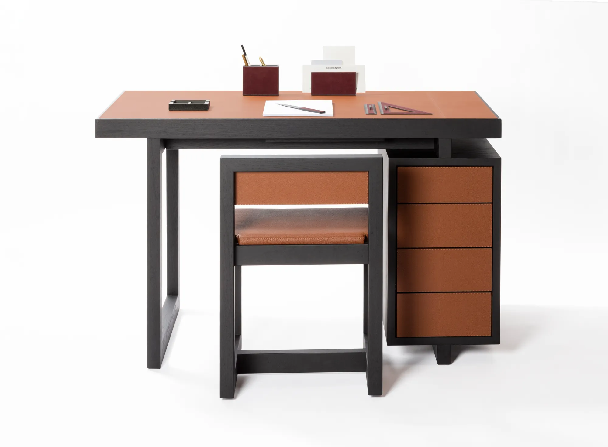 Partially leather-covered wood desk and matching chair provided with wheels. The desk features push-pull capacious drawers customizable with dividers on request. Custom sizes available on request.