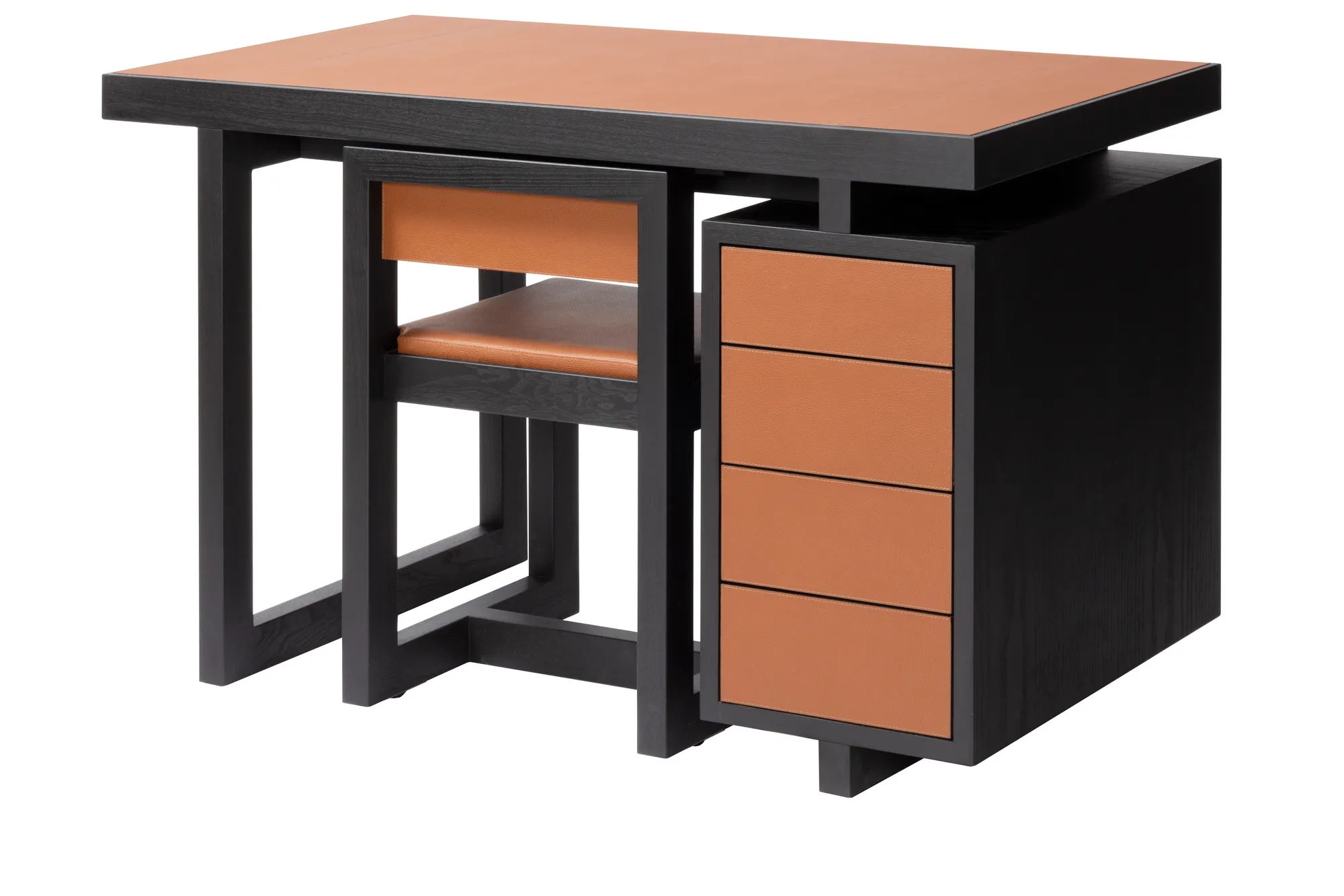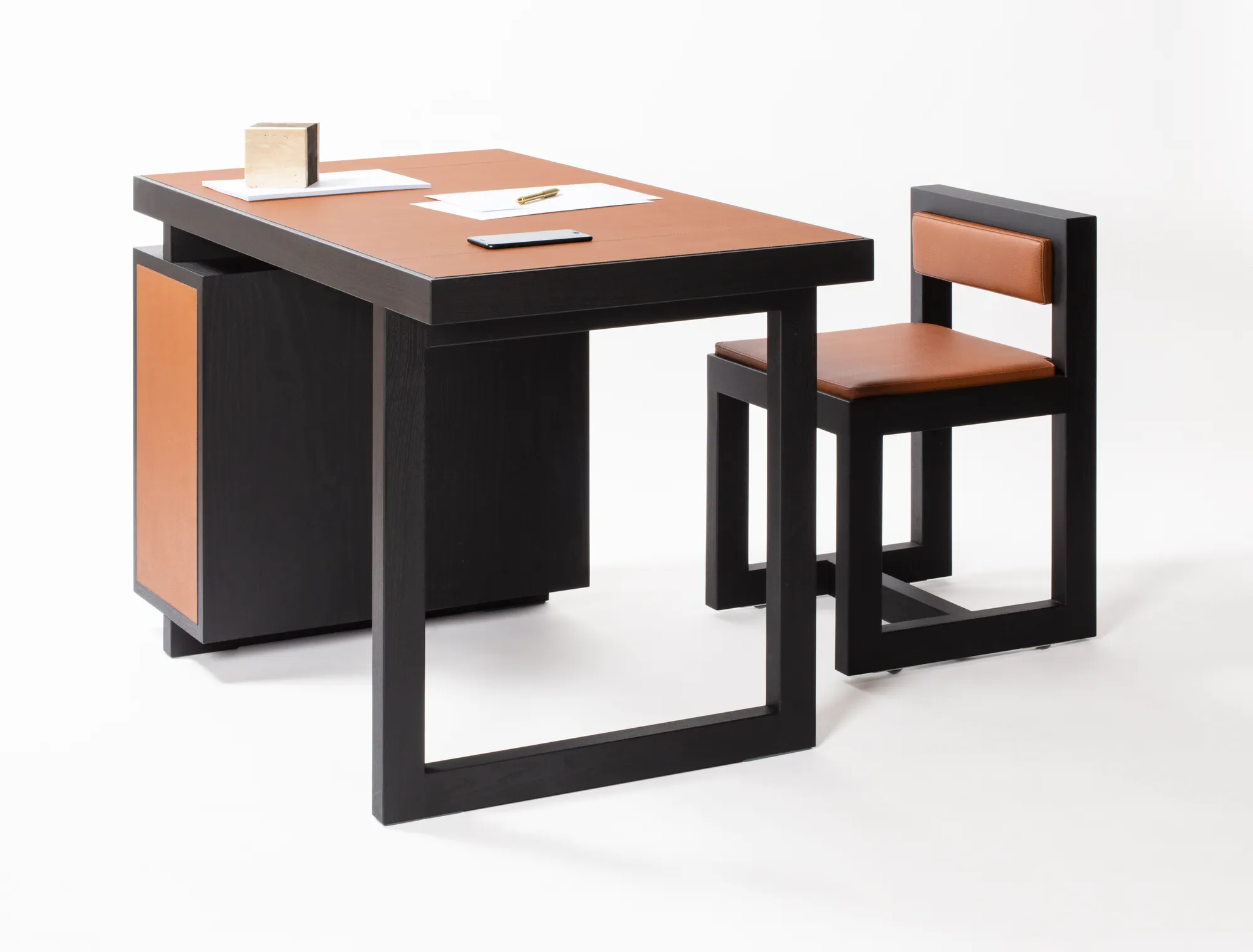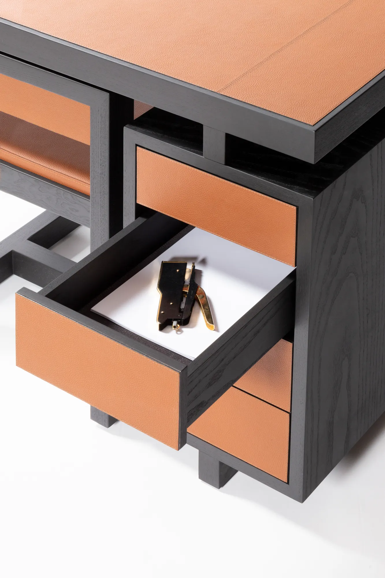 Partially leather-covered wood desk and matching chair provided with wheels. The desk features push-pull capacious drawers customizable with dividers on request. Custom sizes available on request.