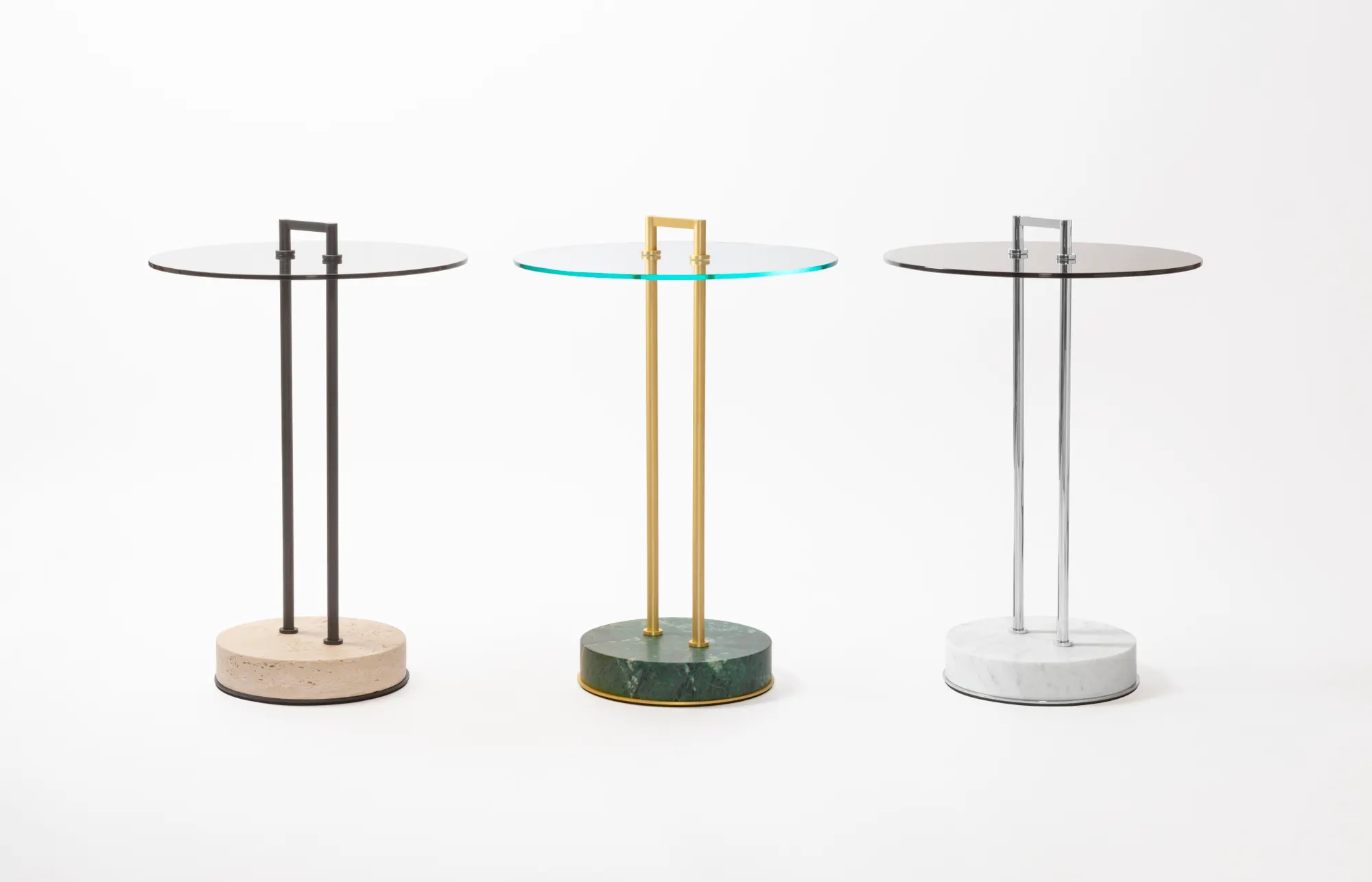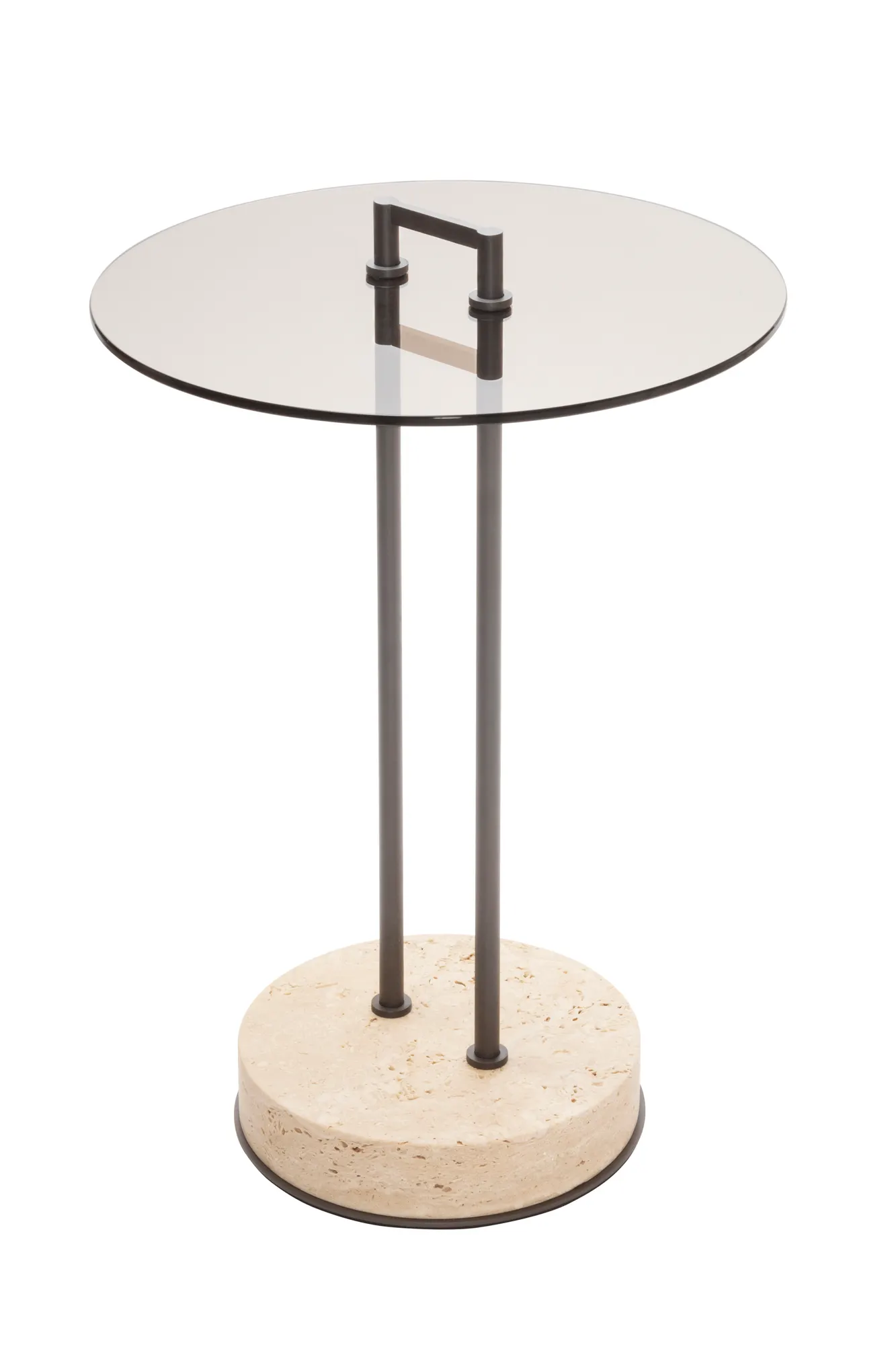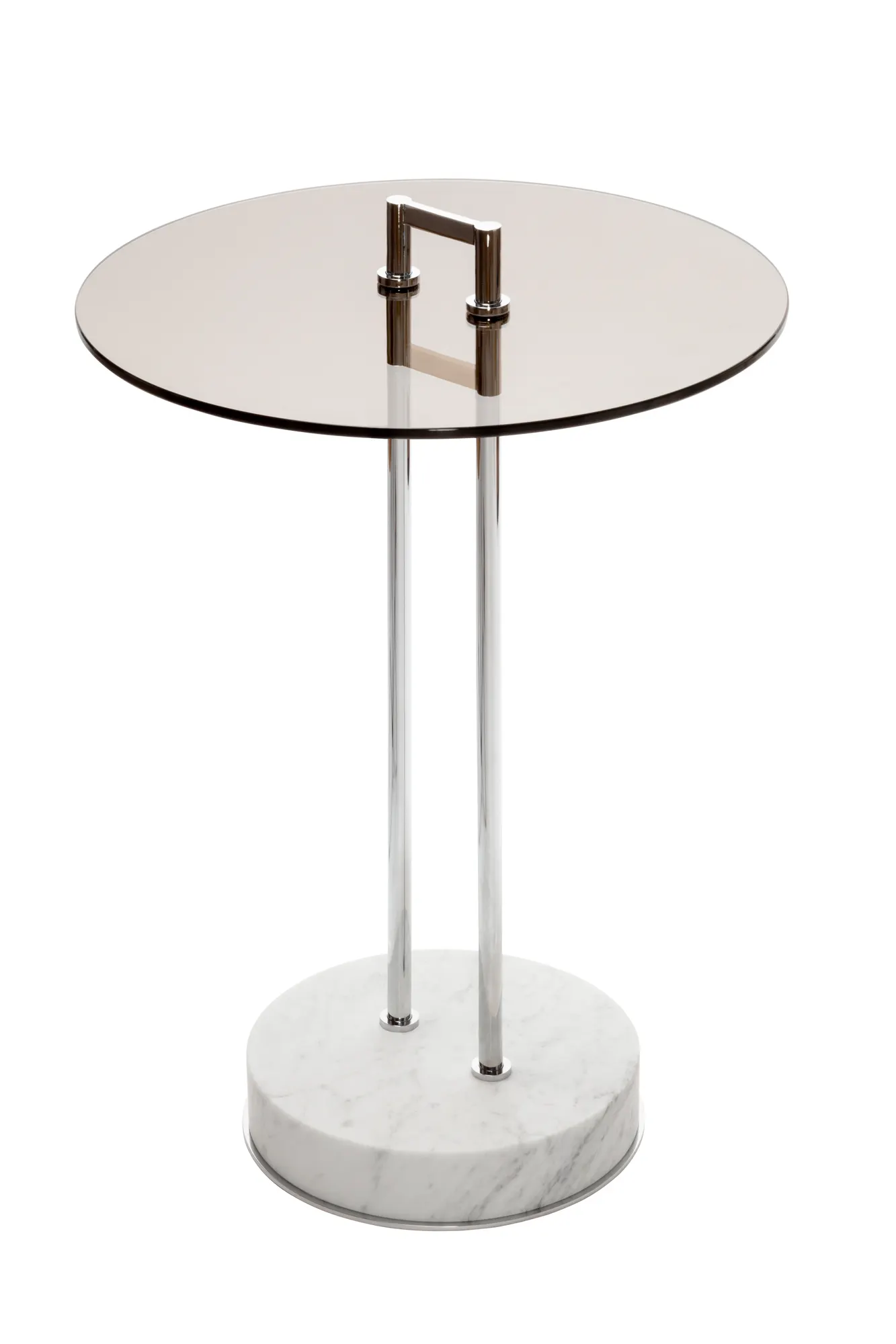 Metal structure available in three different finishes featuring a fine marble base and a glass top which can be either transparent or dark bronze-colored. This slim, elegantly functional occasional table is the ideal solution to enhance any corner of a home.