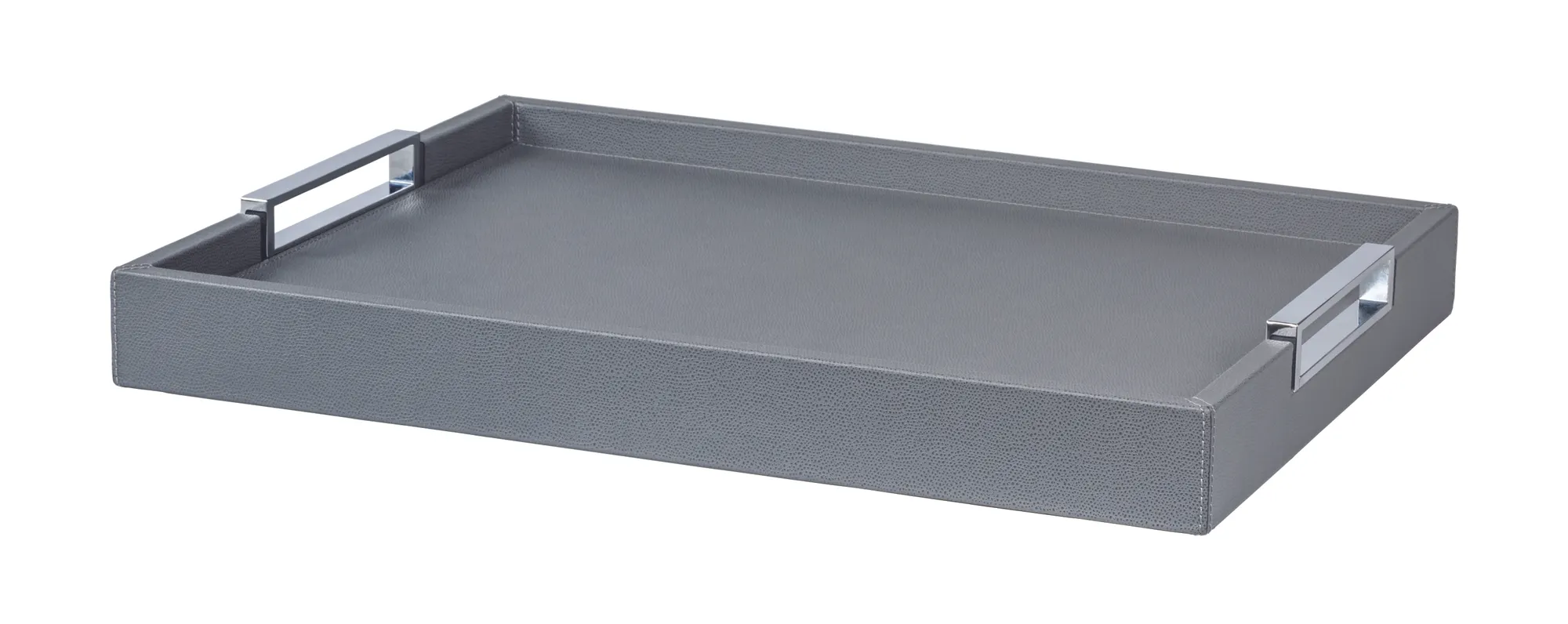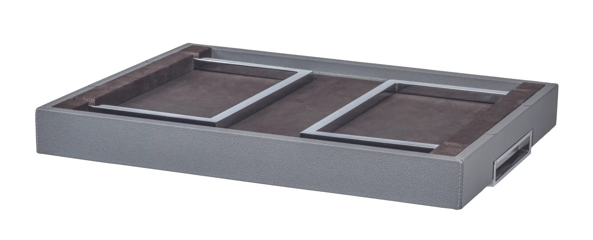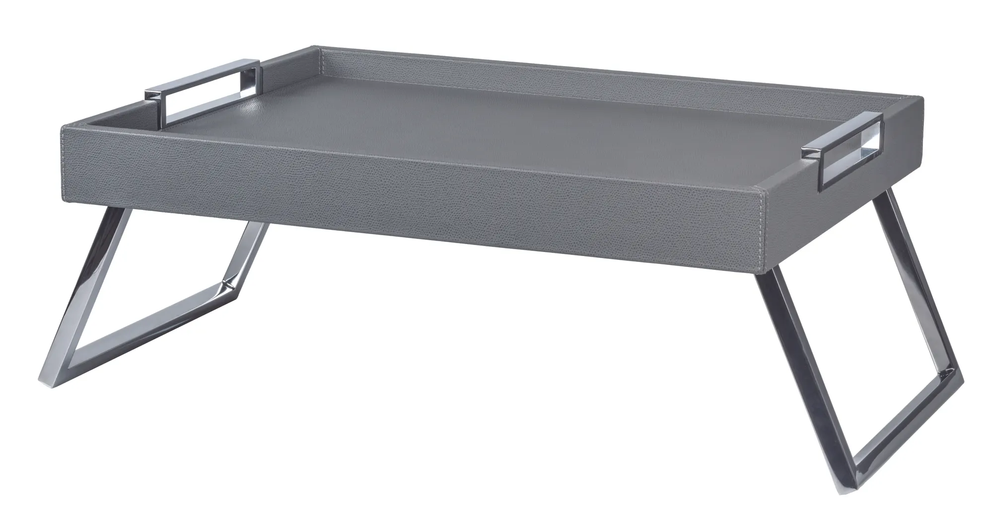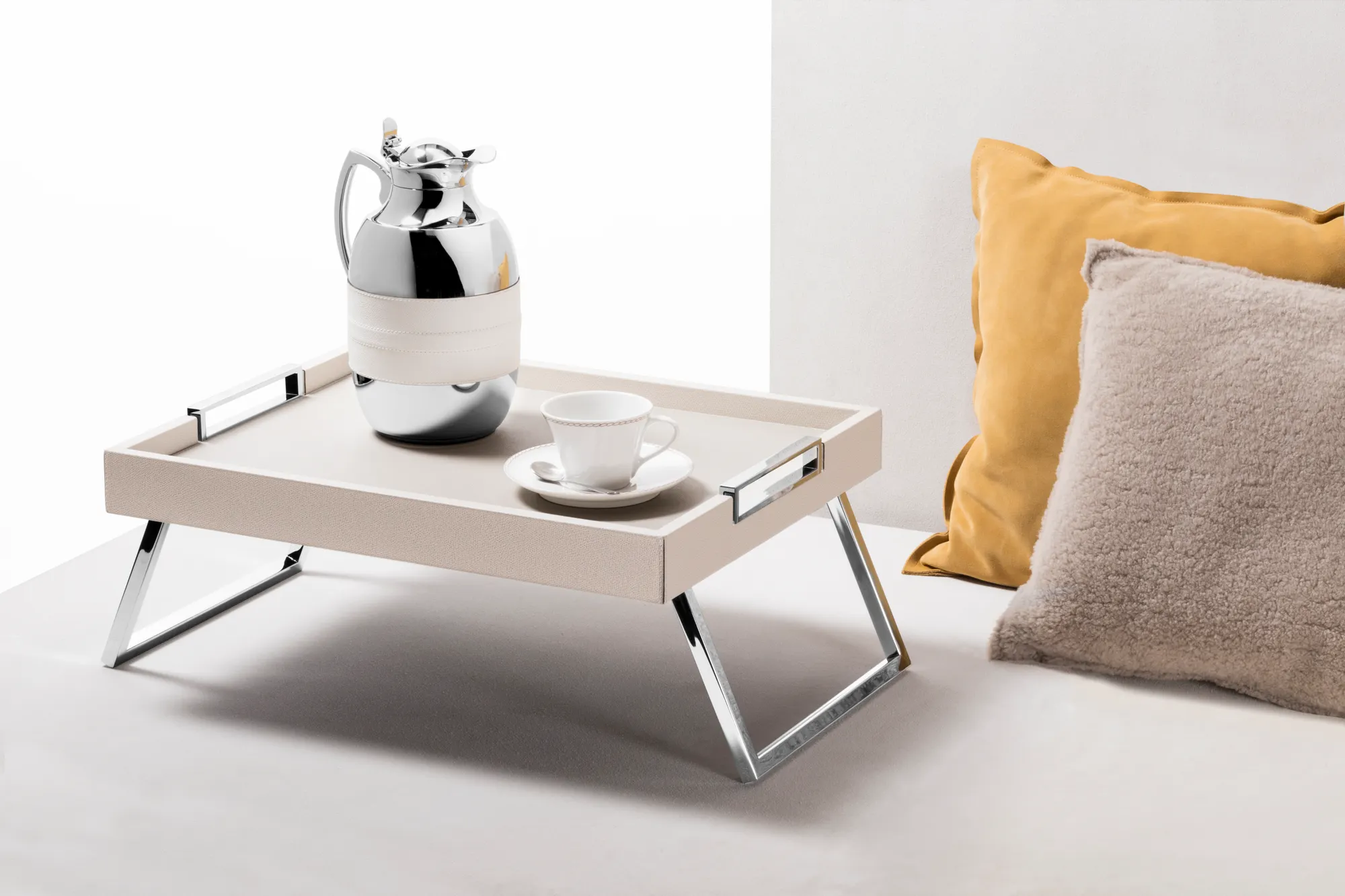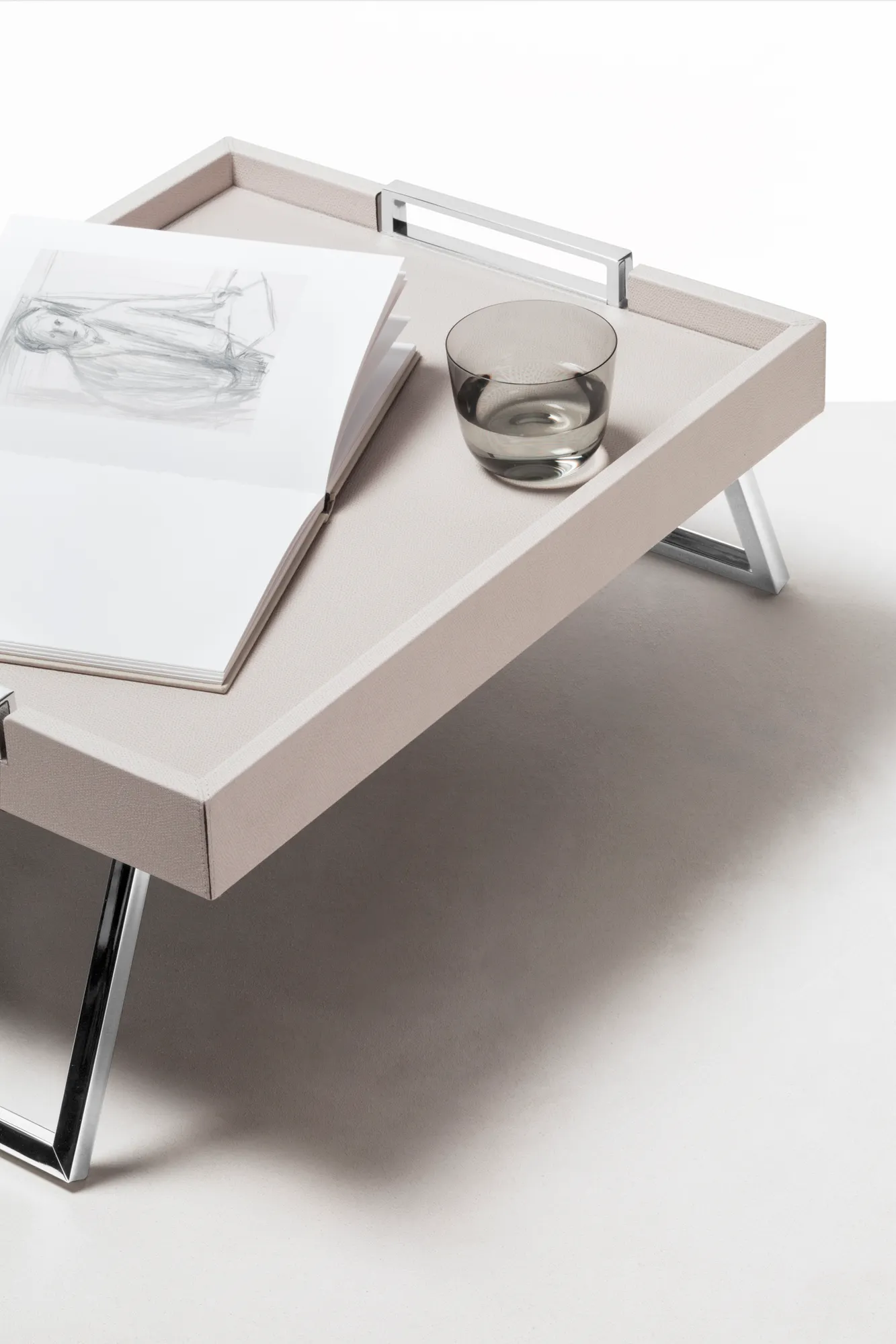 Leather covered wood tray with handles and extractable folding legs with chrome metal finishing. Ideal for breakfast in bed.