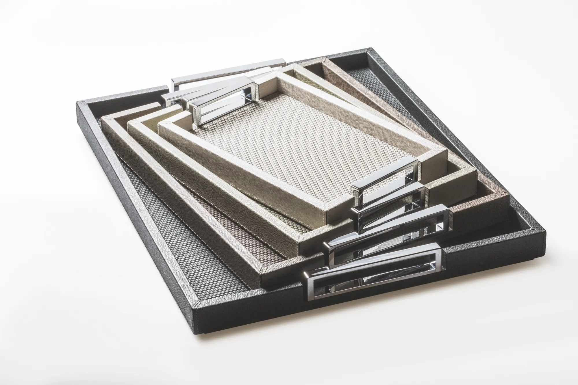 Leather covered wood structure. Metal handles with chrome finish.