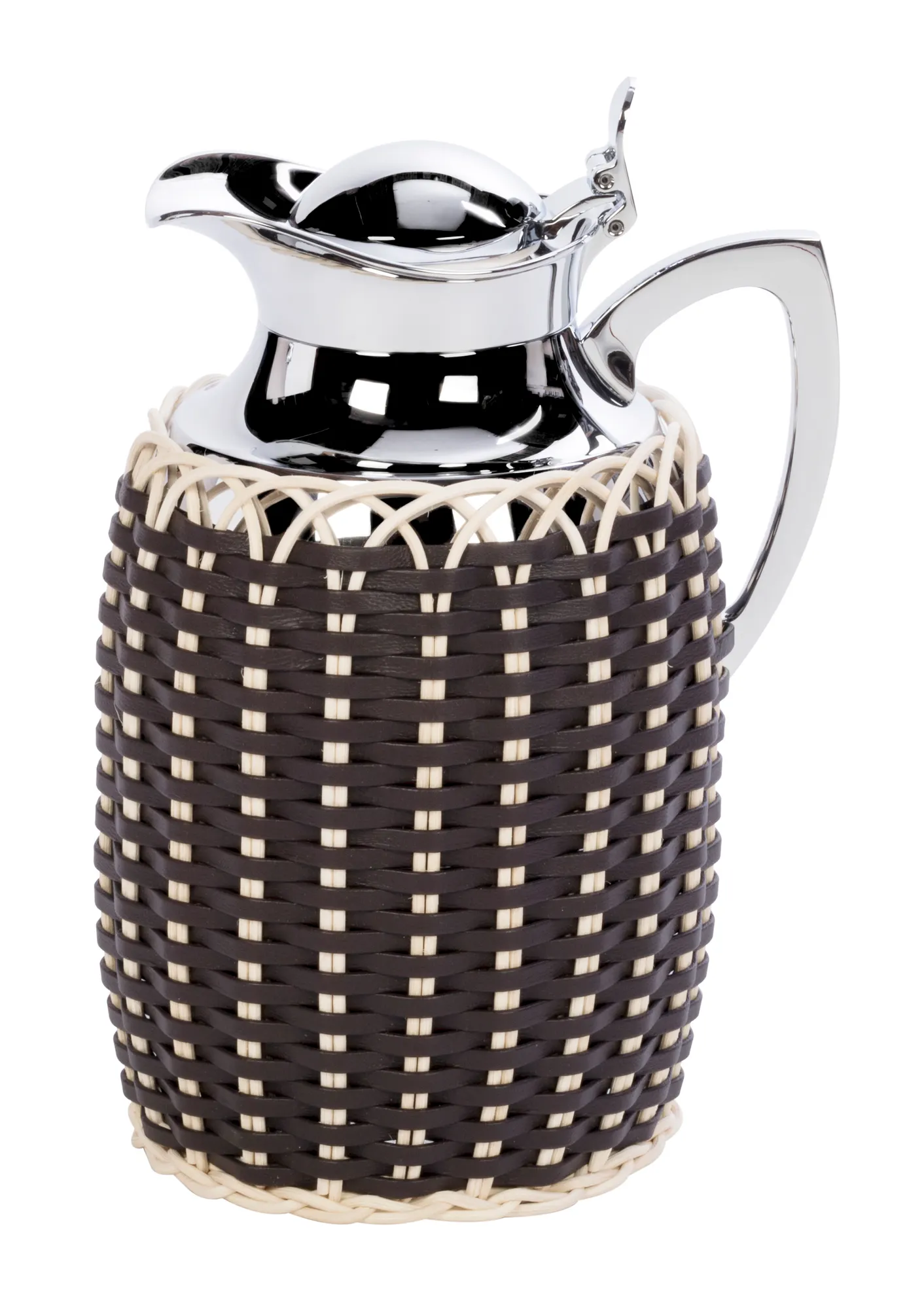 Insulated brass carafes partially covered in woven leather and rattan with a chrome-plated finish. Two-chamber structure maintains temperature of warm liquids for up to 12 hours and cold drinks for up to 24 hours thanks to the inner glass insert. Precise pouring thanks to the specially developed hinged lid with one-hand operation.