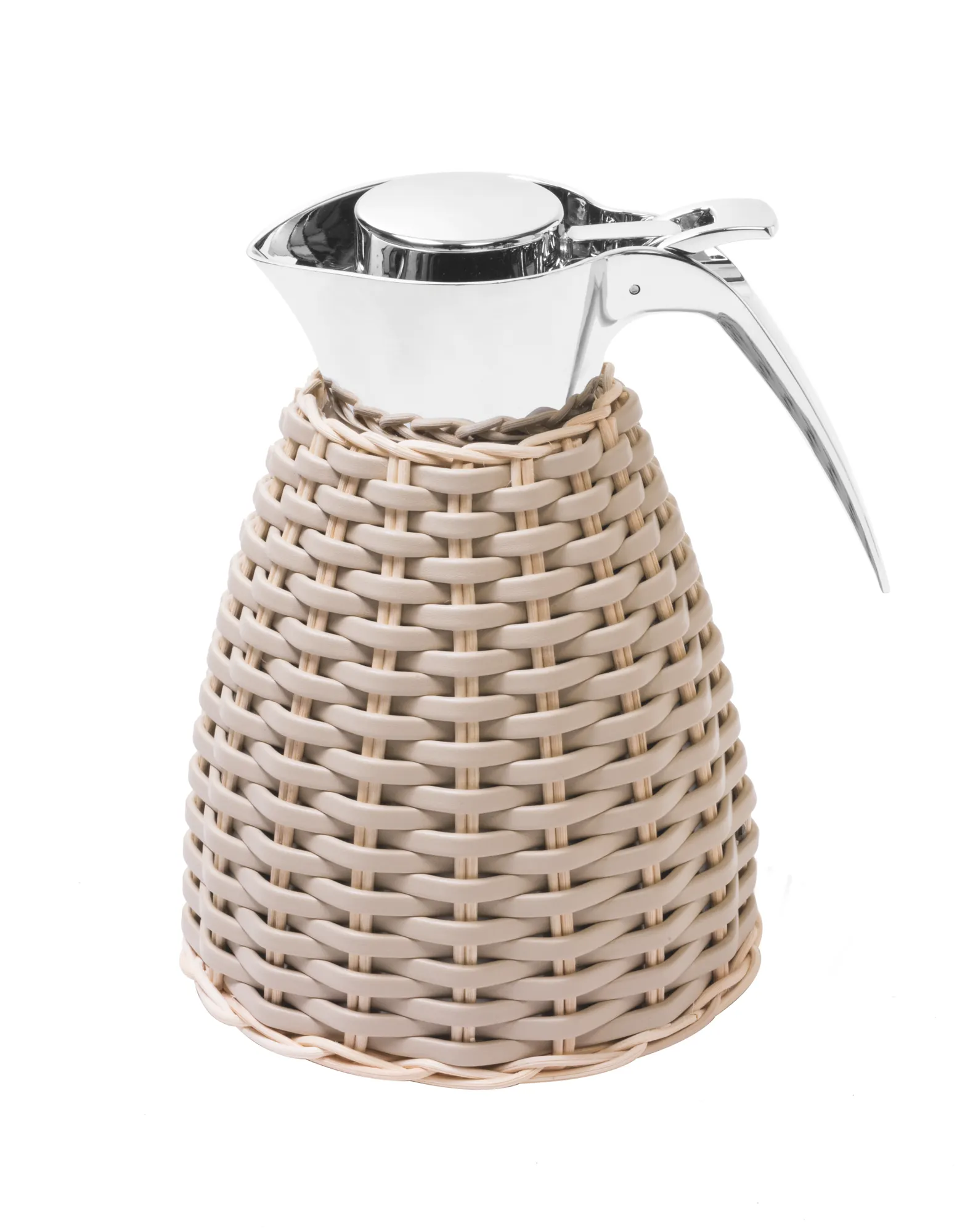 Insulated stainless steel carafes partially covered in woven leather and rattan with chrome-plated finish. Two-chamber structure able to maintain the liquid’s temperatures. Precise pouring thanks to the specially developed hinged lid with one-hand operation.