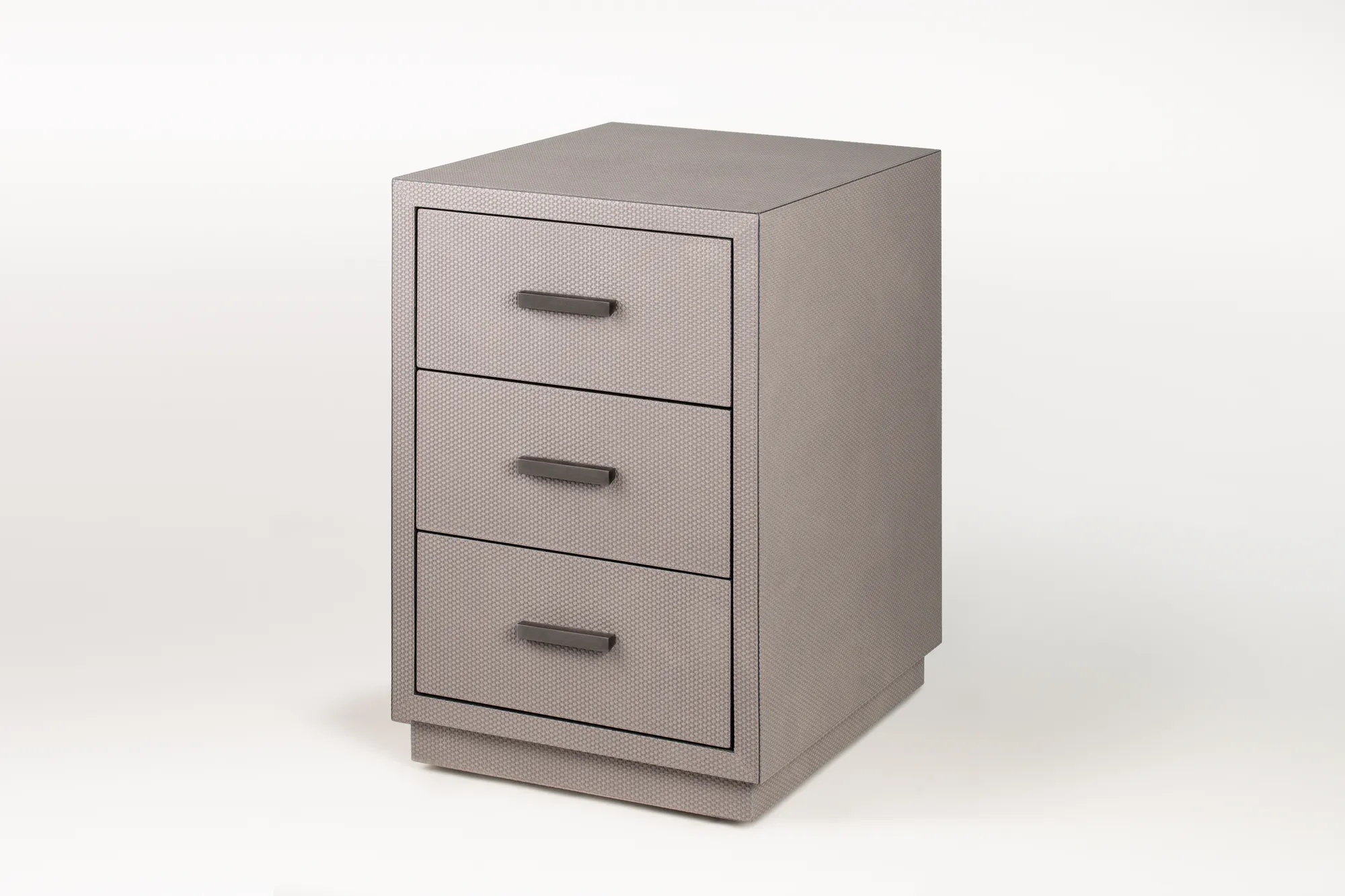 Leather covered wood cabinet with 3 drawers. Special soft-closing drawer with suede lining. Leather covered wood structure with bronze handle. Wenge finished wood inside. Drawers provided with soft closing system and leather insert. Bronze handles and wheels underneath. Custom sizes available on request.