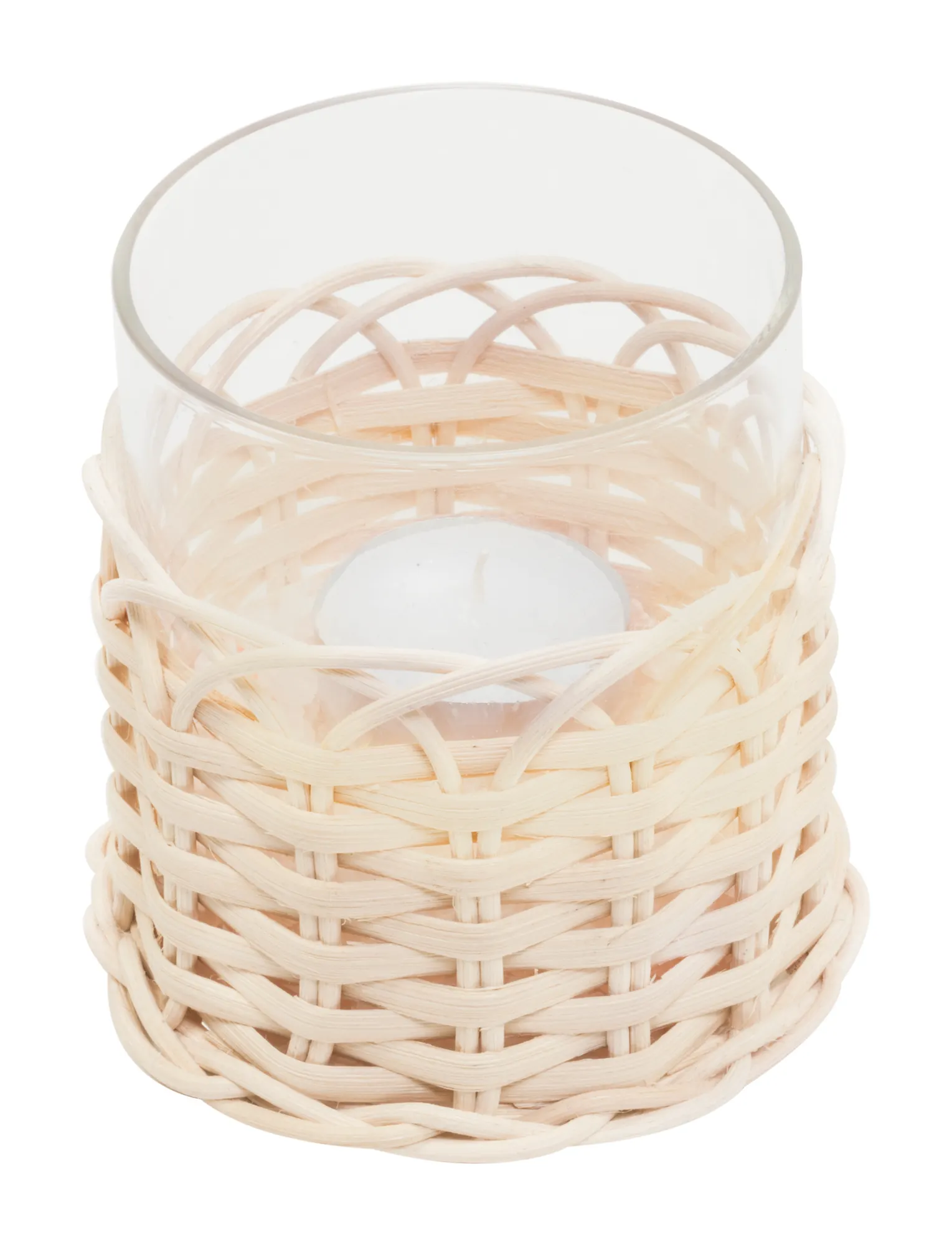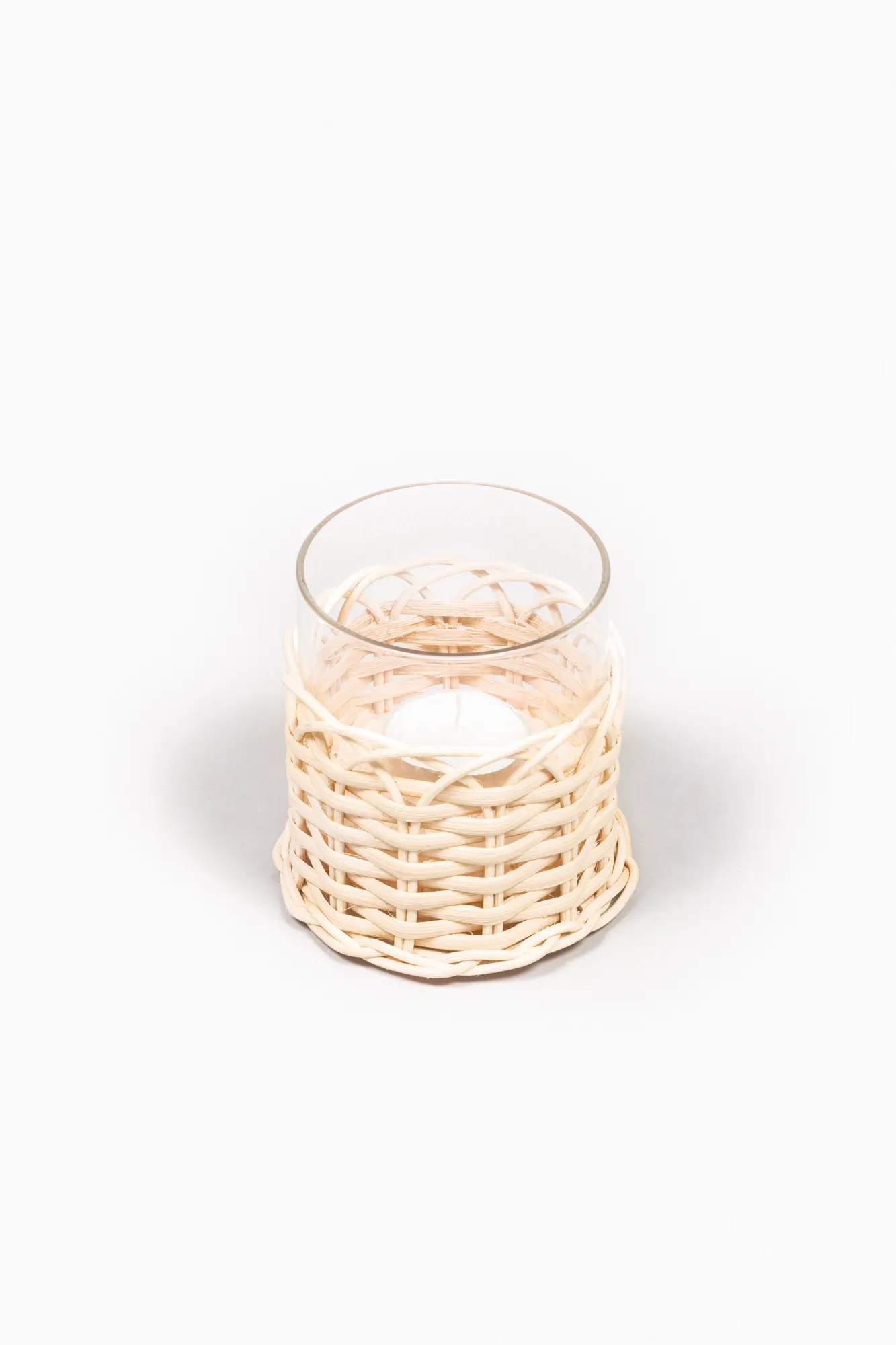 Partially rattan covered table candle holder made of transparent borosilicate glass. Transparent borosilicate glass partially dressed in woven leather and rattan.