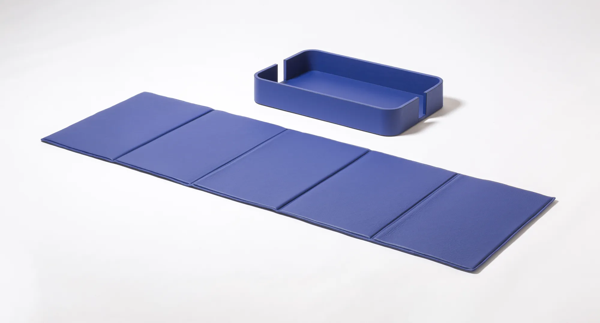 The soft mat is entirely covered in precious Pelle Frau® leather. Ideal for home workout, it is foldable to be comfortably packed inside a matching leather-covered holder.